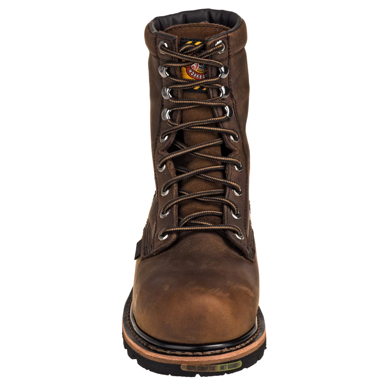 Slip your feet into a pair of these Justin Men’s WK630 Brown 8 Inch Waterproof Composite Toe Met Guard Wyoming Boots as soon as you can. From the round, composite toe coverage to the waterproof uppers and Vibram soles, these are far from ordinary. With all of their protective features, you may not want to ever take them off!