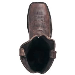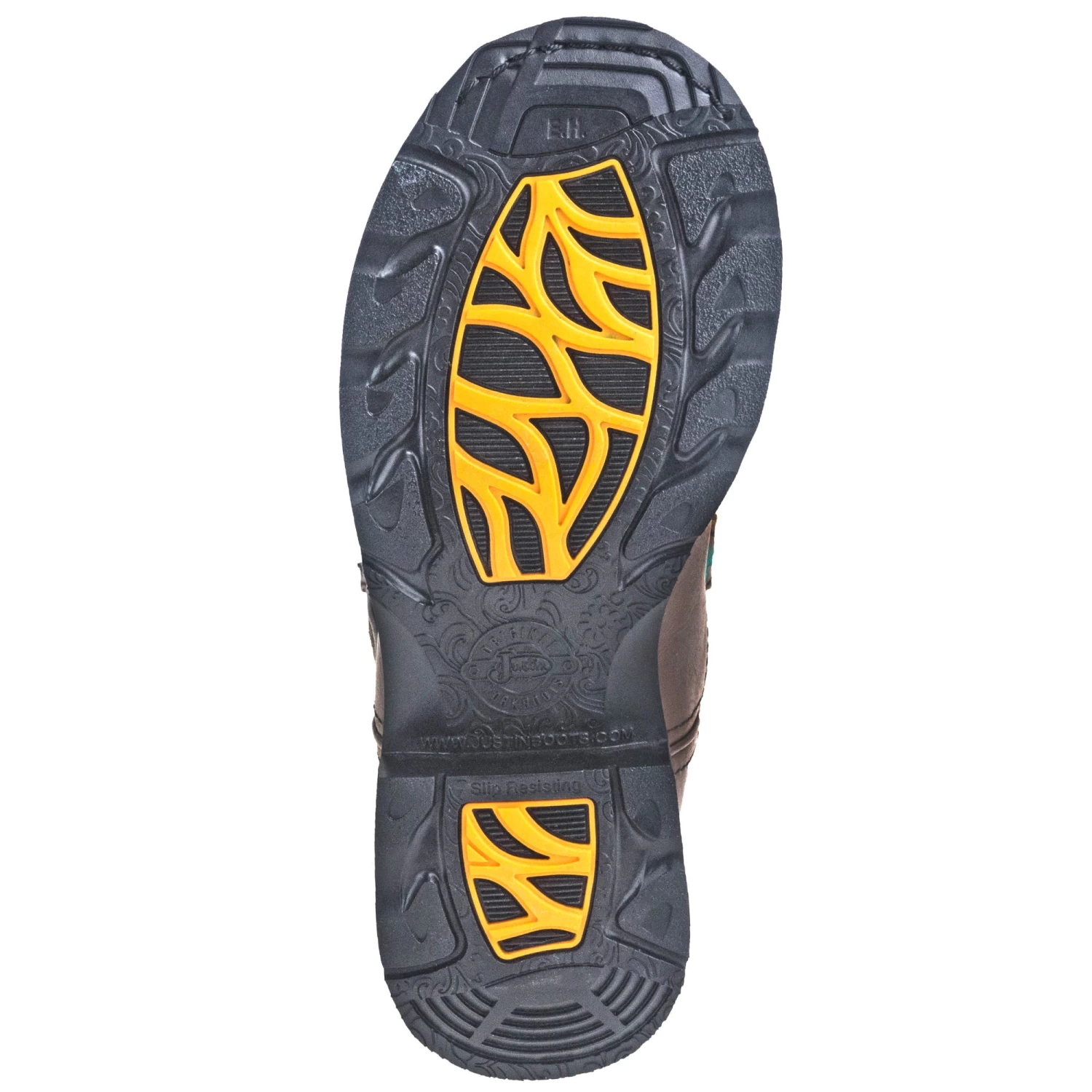 These 11-inch women’s pull-on boots feature rugged chocolate chip brown leather uppers with turquoise and cream stitching on the shaft. With Justin’s own brand of tough waterproofing built right in, your feet will stay dry in these cute leather women’s boots. Easy to pull on with the leather finger pulls at the top, these brown leather cowboy boots add some style to your work day or chore time, and they’re ready for anything the job throws at you. The round Gypsy steel toes offer plenty of room for your comfort and even more strength to protect your toes from compression or impact. Safety is a priority for your and for Justin boots, who won’t let you down when you need them.