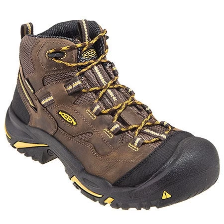 Next, this men’s footwear is manufactured from waterproof nubuck leather, so they’re extra tough and they’ll keep your feet extra dry. Extra dry? Yes, because these brown boots also have KEEN Utility’s very own dry waterproof, breathable membrane (KEEN.Dry membranes). So your leather stays in great shape, which is perfect for handling a long, hard working life. In addition these premium shoes are lined with hydrophobic/hydrophilic two zone comfort technology, too, so even on the insides, there’s more insurance against getting wet. And comfort is another important ingredient in what is a great pair of steel toe boots to own.
