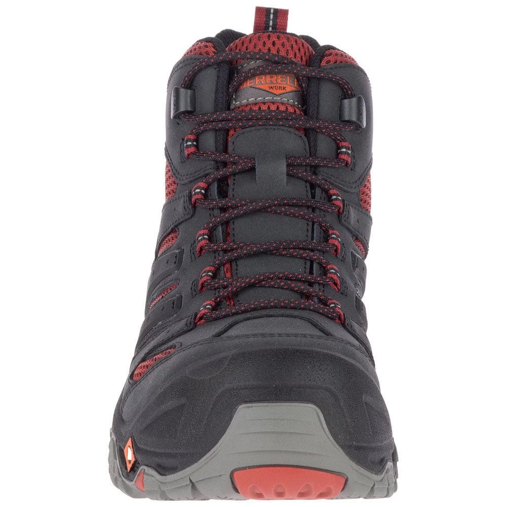 Waterproof synthetic-coated leather and mesh uppers are beyond ready to take on wet weather conditions, and the Merrell M Select™ DRY impermeable membranes seal out water and let moisture escape as well. This unique Strobel construction is dependable as it maintains a dry, comfortable environment for your feet. For midfoot support and flexibility, the waterproof Merrell boots have molded nylon arch shanks. Heat-resistant outsoles are included in these black and red safety toe boots, and they provide foot protection for brief periods of direct contact that meet or exceed 500 degrees Fahrenheit (of 260 degrees Celsius).