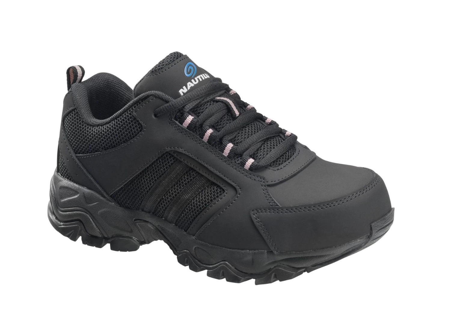 These Nautilus women’s shoes feature lightweight composite safety toe caps that meet or exceed the ASTM 2413-17 I/75 C/75 impact and compression specifications. Rolling or falling objects can try to smash your toes while you’re at work (or anywhere else you might venture), so be sure you have the proper safety toe coverage. The lace-up black footwear also meets EH (electrical hazard) safety standards to guard you around live circuits under certain dry conditions.