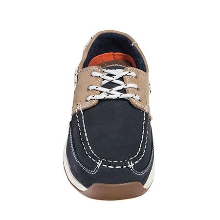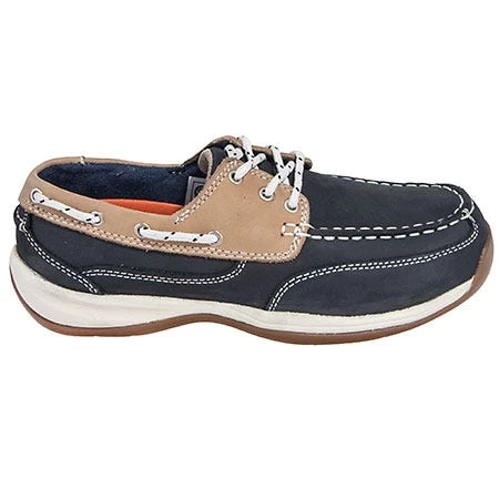 The two-tone, low-cut design of these boating shoes would be perfect for a day of shopping or a trip to the park. But, with their steel safety toes are are ready for some work situations, as well. The light tan Nubuck leather brightens up the navy blue, while visible white stitching ties the entire design together. Nubuck leather has the touchability of suede, but it performs as durably against weather and wear as full-grain leather. Even the laces are made in a two-tone design, with navy accents decorating the pure white. It’s a classic 3-eye tie boat shoe…and it’s also perfect for using as work shoes.