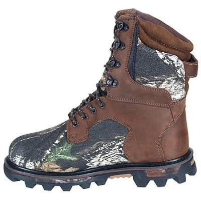 Manufactured with brown Full Grain leather and durable Mossy Oak nylon camouflage, these boots are built strong. The BearClaw 3D outsole features an oil- and slip-resistant tread to help you dig into the landscape. 1000-gram Thinsulate Ultra insulation delivers warmth without extra bulky weight on those frosty hunts.