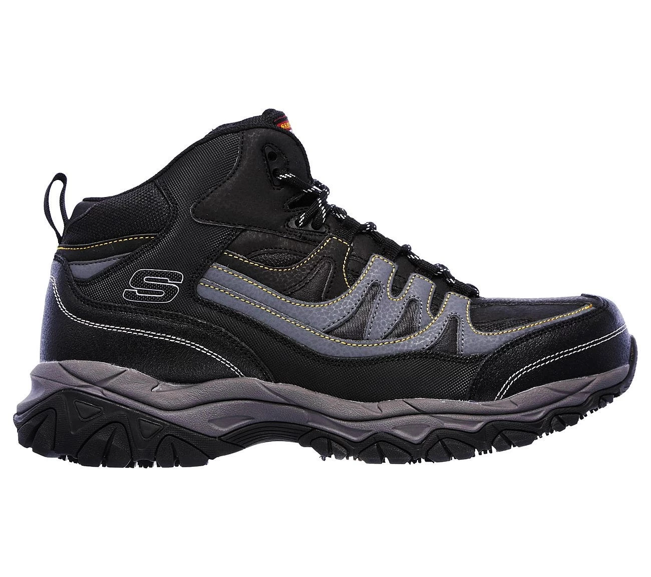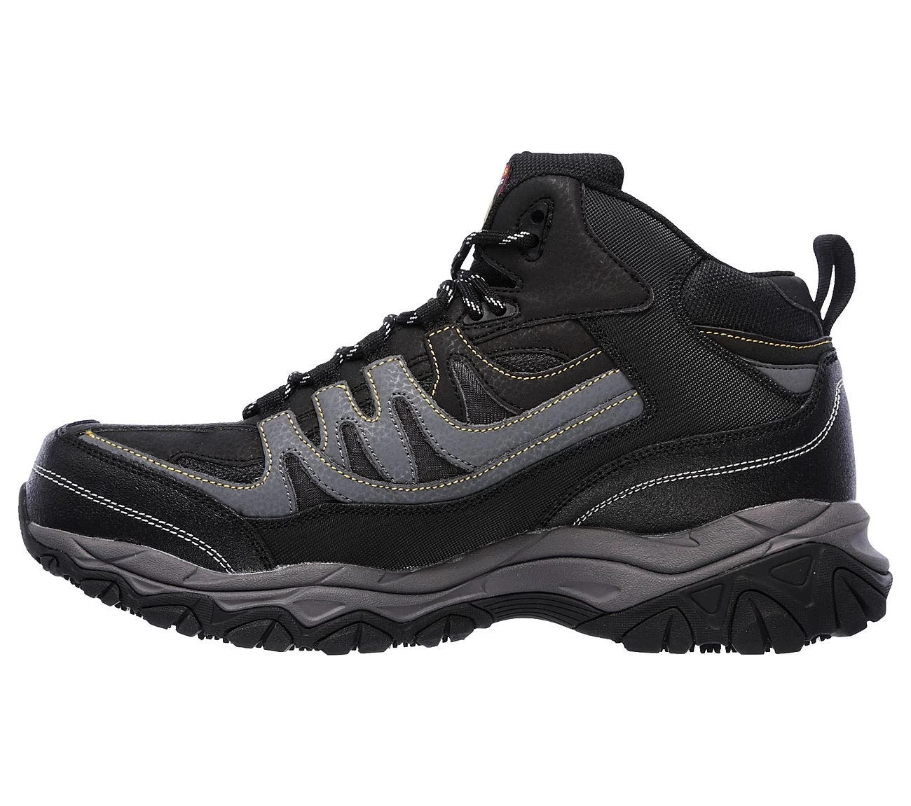 The electrical hazard safe design is rated ASTM F2413-2011 to guard you around open circuits under certain dry conditions. Your toes will also be shielded against impact and compression hazards, thanks to the steel safety toe caps. These durable steel toe hiking boots meet the ASTM F2412/2413-2011 I/75 C/75 safety rating, and they offer coverage for your toes against rolling or falling objects that can cause harsh injuries that could put you out of work for weeks – or longer. Get high-quality safety from these Skechers men’s boots.