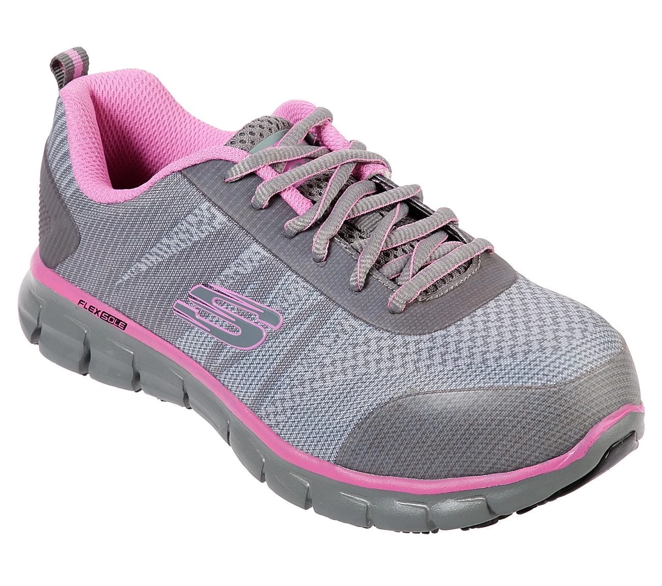 Are you ready to blow your own mind? You’re the one who landed on this page, so you must’ve known what you were searching for! These ~Skechers Women’s 77250 GYPK Grey Pink Sure Track- Saquenay Alloy Toe Athletic Shoes are constructed with alloy safety toe caps to guard your toes against impact and compression, and they’re equipped with superior comfort and style to boot. Your feet are already thrilled that you’ve ended up checking out our Working Person’s Store site, so feel free to satisfy your workplace footwear needs with these Skechers athletic shoes.