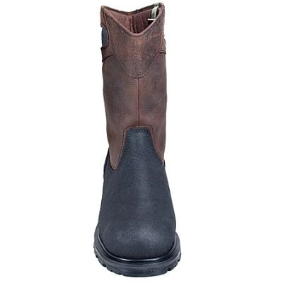 These brown cowboy pull-ons feature Goodyear Welt Cast-Bond construction, which secures the soles to these slip-resistant boots with durable welted-together strength and gives you added stability. Goodyear construction also gives you a contoured foot. Steel safety toes shaped on TiTAN last provide a superior fit.