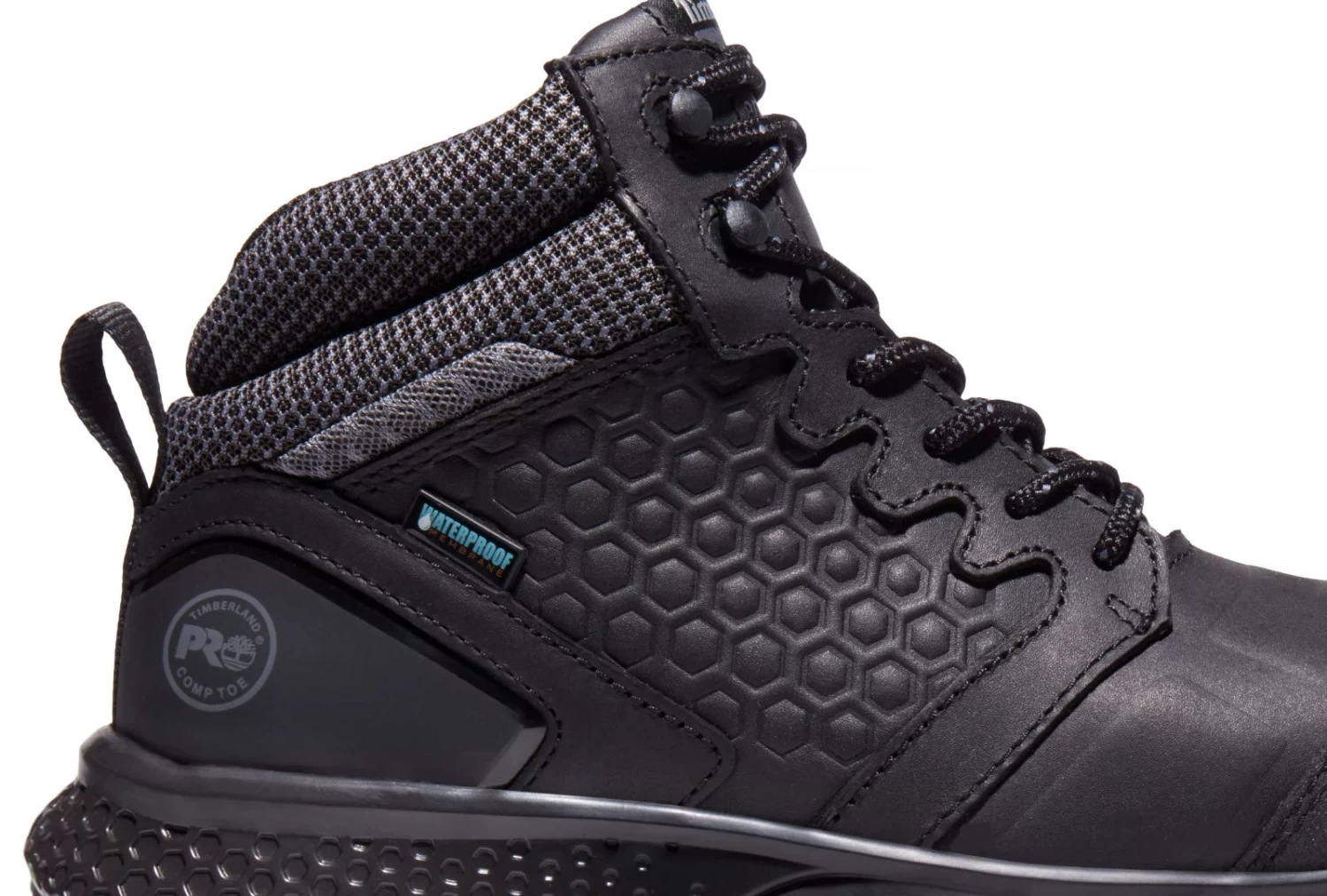 No matter where you venture, your toes need to be protected. That’s why these black and grey waterproof boots feature composite safety toe caps that are powered by CarbonShield™ technology. The lightweight composite toes are just as strong as most steel toe options without the excess weight, and this pair of Timberland Pro safety toe boots is ANSI/ASTM I75 and C75 approved for your convenience. Full-grain leather uppers are included for excellent abrasion resistance, and the Reaxion style is created with a waterproof membrane construction to keep your feet dry and comfortable as you work all day.