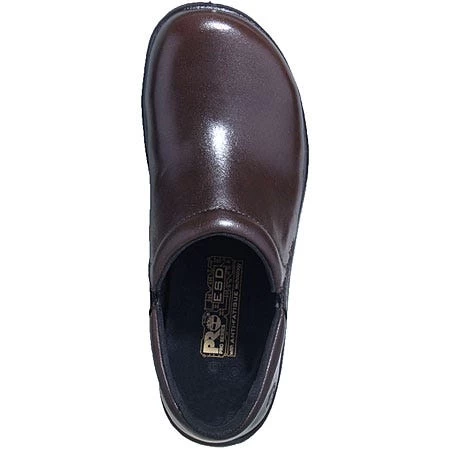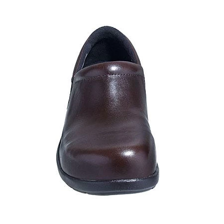 This cute clog design is super feminine and features a polished dark brown leather upper. Top stitching on the upper and a vine design on the outsoles create charming style. The alloy safety toes keep your feet safe from rolling and falling objects. These alloy toe shoes are also Electric Static Dissipative, which means you can work safely around charged equipment.
